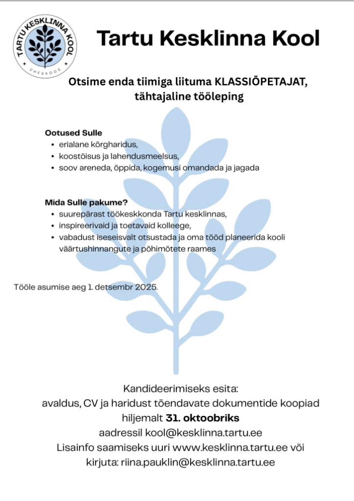 Vabad ametikohad Siin lehel avaldame kõikide täitmata ametikohtade pakkumisi ja soove. Ootame sind, klassiõpetaja!