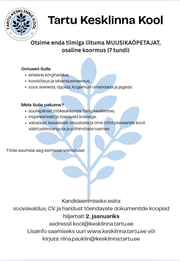 Vabad ametikohad Siin lehel avaldame kõikide täitmata ametikohtade pakkumisi ja soove. Muusikaõpetaja töökuulutus